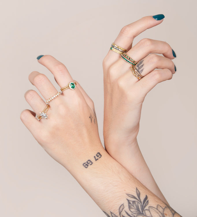 For us, this means working exclusively with materials that are responsibly sourced and produced - which includes Fairtrade Gold, Fairmined Ecological Gold, recycled metals, conflict-free diamonds and fair-traded gemstones. It means commissioning skilled local craftspeople in London to bring our designs to life, championing traditional British craftsmanship and minimising the distance our materials travel. It means thoughtful design that draws inspiration from a variety of natural, historic and cultural phenomenons.